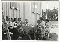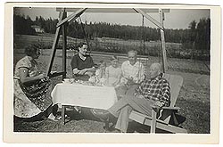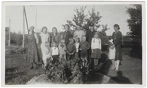 Aikuiset vasemmalta Aino,?, Elli ja Helmi Malm, Fanny, Yrjö, Helmi ElomaatLapsia Tuomo ja Paaso Elomaa, Kai ja Anna Liisa Antturi