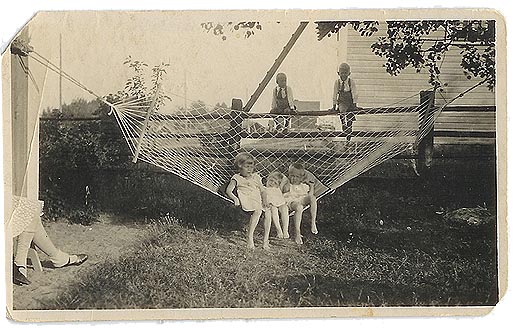 Selissä kesällä 1930. Aidalla Tuomo ja Paaso Elomaa. Keinussa Anna Liisa, Kirsti ja Kai Antturi